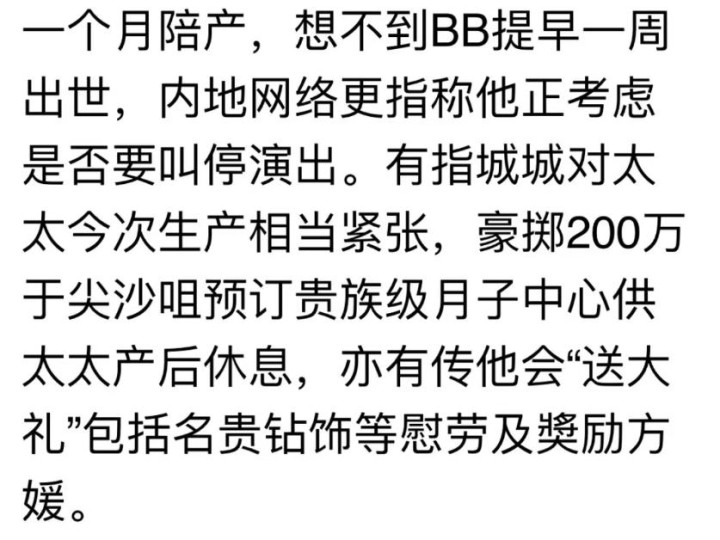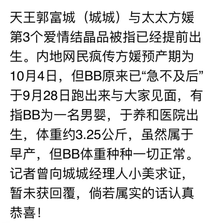 然则,今日城城并未现身领奖台,起先有东谈主忖度他正忙于为11月的高雄演唱会病笃排演,但本色情况可能是,就在那天,他再次荣升为父亲,正留在病院,满心鼎沸地舆财新人命的到来,并提防不休着夫妻。港媒称方媛是在养和病院诞下3.25公斤的男婴。坐蓐技艺被指是9月28日,属于早产儿,但体重一切往往。