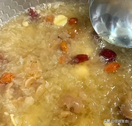 2. 锅中加足量净水,放入银耳、莲子、百合,大火煮开后转小火,慢炖40分钟,直到银耳变得黏糯出胶。