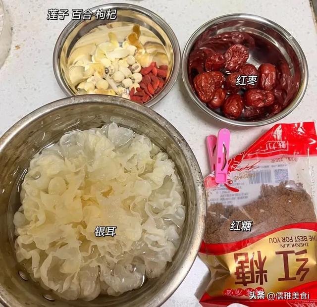 1. 银耳提前用净水泡发,剪掉底部硬根,撕成小小的碎朵,这么更容易煮出胶;百合、莲子冲洗干净,红枣去核备用。